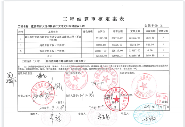 歙县布射大道与新安江大道交口周边建设工程结算审核定案表
