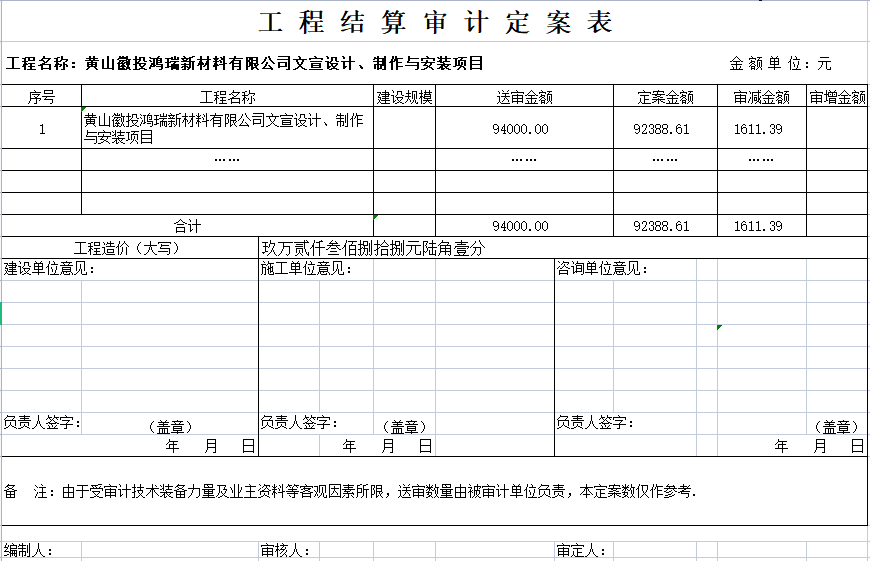 黄山徽投鸿瑞新材料有限公司文宣设计、制作与安装项目结算审核定案公示