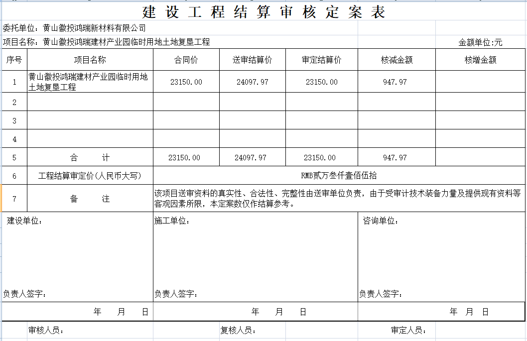 黄山徽投鸿瑞建材产业园临时用地土地复垦工程结算审核定案表