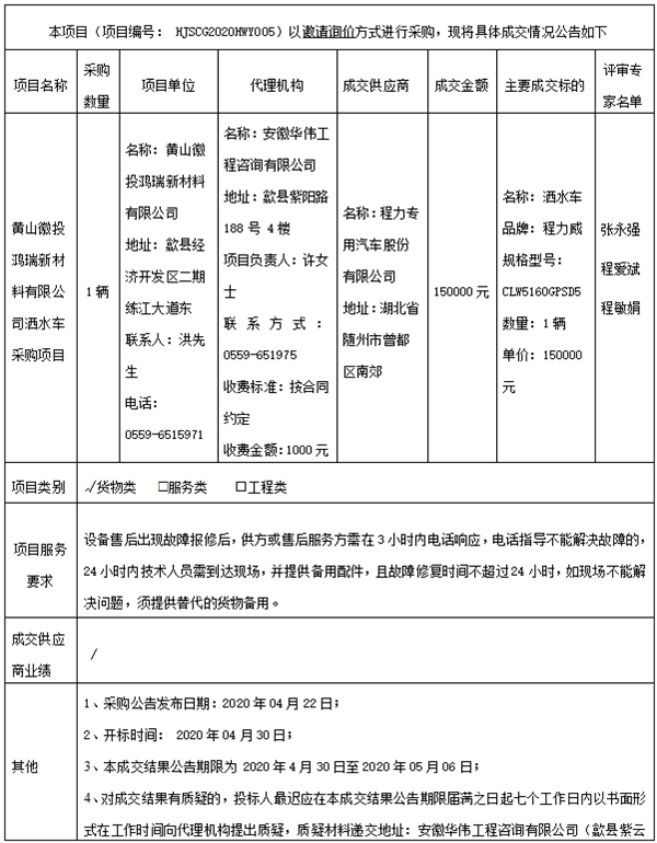 黄山徽投鸿瑞新材料有限公司洒水车采购项目成交结果公告