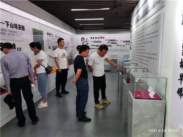 会后,大家参观了六联村胡早娣劳模纪念馆,深入学习了劳模精神。胡早娣是社会主义建设初期涌现出的巾帼劳模,她团结多名年轻妇女,组建了一支铁姑娘专业队治山治水,使荒山秃岭变成了层层梯磅茶园。1957年胡早娣代表六联茶业社进京参加表彰大会,捧回了周恩来总理亲笔题词“发展山区经济,搞好水土保持”的锦旗,时至今日,六联精神和胡早娣的名字仍在江淮大地广为传颂。